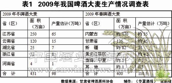 據介紹,全國冬播和春播啤酒大麥的種植面積均比年初統計數有所減少。其中冬啤酒大麥種植面積431萬畝、產量96萬噸,分別比年初統計和預測數下降4.3%和2%;春啤酒大麥種植面積400萬畝左右,產量估計為110萬噸,面積和產量與2004年相當,為近6年來首次滑落。由表1可見:2009年大麥實際種植面積和預計產量分別比2008年的1230萬畝和344萬噸減少32%和40%;預測可作為商品啤酒大麥的總量估計只有160萬噸左右。面積下降最多的在春大麥主產區,分別是內蒙古、甘肅、新疆、黑龍江墾區等,下降幅度在30%—55%之間。