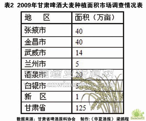 甘肅今年啤酒大麥種植面積由2008年的200多萬畝下降到年初統計數的130萬畝。但實際種植面積可能在125萬畝左右;河西走廊主產區旱情較重,減產已成定局,單產平均減幅有可能在10%—20%之間。全省啤酒大麥總產估計不到50萬噸。(表2是2009年甘肅啤酒大麥種植面積市場調查情況表。注:1、酒泉、張掖、金昌、武威四地市含農墾所在地種植面積。2、新區包括:章縣、臨潭、合作、康樂、和政、臨夏、積石山。)