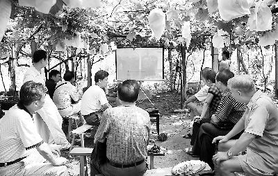 8月5日,建陽鑒湖葡萄品種園中,吸引了一批批的游客和閩北葡萄栽種戶,他們在一塊白色大屏幕
