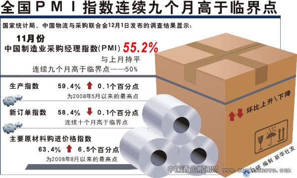 新華社北京12月1日電 國(guó)家統(tǒng)計(jì)局、中國(guó)物流與采購聯(lián)合會(huì)12月1日發(fā)布的調(diào)查結(jié)果顯示,11月份全國(guó)制造業(yè)采購經(jīng)理指數(shù)(PMI)為55.2%,與上月持平。這是全國(guó)PMI指數(shù)連續(xù)9個(gè)月位于臨界點(diǎn)——50%以上,表明全國(guó)制造業(yè)總體保持平穩(wěn)回升態(tài)勢(shì),經(jīng)濟(jì)總體處于擴(kuò)張區(qū)間。