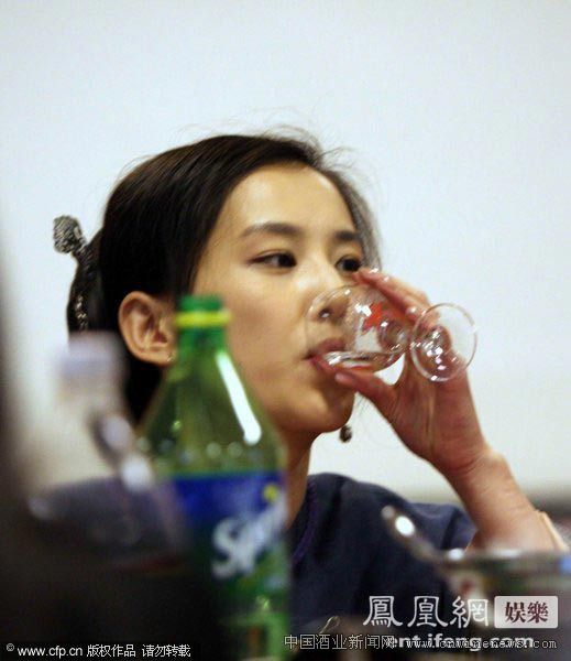 圖注:黃圣依餐桌上拼酒力。(圖片來源:CFP圖庫供稿) 2010年1月12日訊,浙江橫店,電影《絕戀》昨(11日)舉