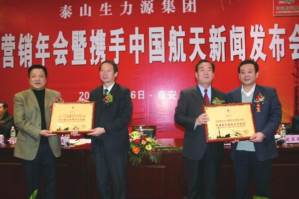 1月6日,泰山生力源2011年營銷年會暨攜手中國航天新聞發布會在山東省泰安市舉行。來自中國航天基金會領導及山東省、泰安市行業管理部門領導和泰山生力源經銷商代表、新聞媒體代表近500人參加了這一盛會,見證了“泰山”2010年輝煌佳績和與中國航天的成功“聯姻”,成為“中國航天事業合作伙伴”和“中國航天專用慶功酒”振奮時刻。