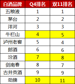得益于對京東雙11大促的積極參與,以及后續持續的品牌推廣與曝光,五糧液、茅臺、洋河、牛欄山、瀘州老窖、郎酒、汾酒、劍南春、古井貢酒在第四季度銷量一路飄紅。其中,牛欄山通過最大化的依托京東品質服務優勢,并與京東深入配合爆品直降,重新奪回京東白酒第四品牌寶座!同時,汾酒則通過與京東官方旗艦店推出品牌聯合滿減大促,一舉改寫京東白酒排行榜,在第四季度銷量力壓劍南春!雙十一期間,勁酒屈居習酒之下未能進入前十名,通過與京東戰略合作定制爆款,12月實現突破性增長,第四季度整體排名沖刺至前十!