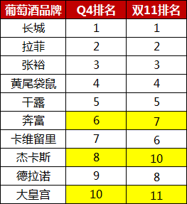葡萄酒排行榜中前五位較雙11排名沒有變化,依然被長城、拉菲、張裕、黃尾袋鼠、干露占據。此外,杰卡斯較雙11上升兩個名次,位列第8名,充分體現了其舉行品牌推廣的重要價值。奔富、大皇宮較雙11上升一個名次,分列第6名和第10名。