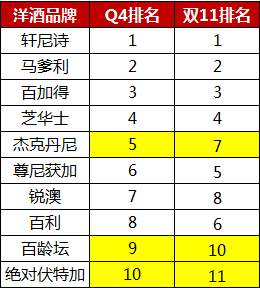 在洋酒排名榜中,杰克丹尼進軍榜單前五的位置,憑借保樂力加品牌集團的持續推動的支持政策,百齡壇品牌較雙11排名上升,其集團旗下的品牌絕對伏加特也躍進TOP10。
