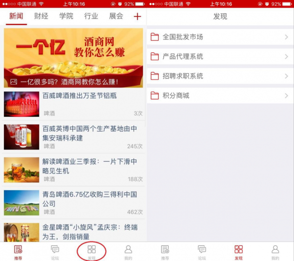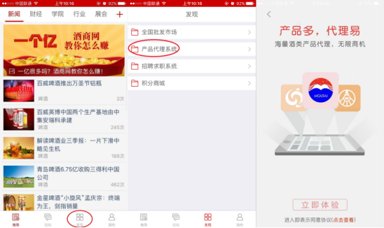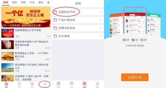 第三步,點擊發現,進入進入酒商商務服系統(全國批發市場、產品代理系統、招聘求職系統、積分商城)