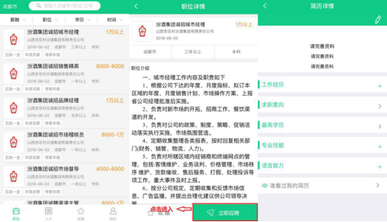 3.2選擇自己中意的崗位,進入,點擊我要應聘,添加個人簡歷,提交完成應聘。