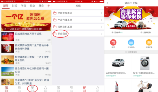 4.積分商城是酒商網專屬禮品商城,用戶可用酒商幣在商城免費兌換汽車、名牌奢侈品、高端家用電器、電腦、iphone7等眾多好禮,只要酒商幣達到兌換要求,就能將他們通通帶回家。當前酒商幣獲取方式主要有三種:下載注冊、邀請好友、發帖。