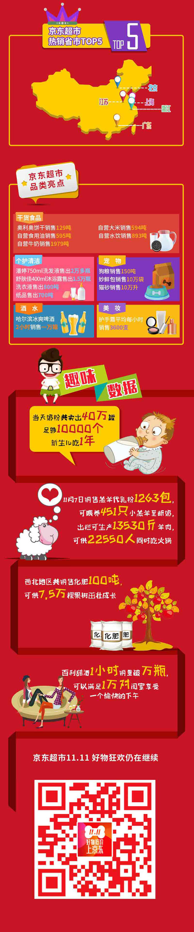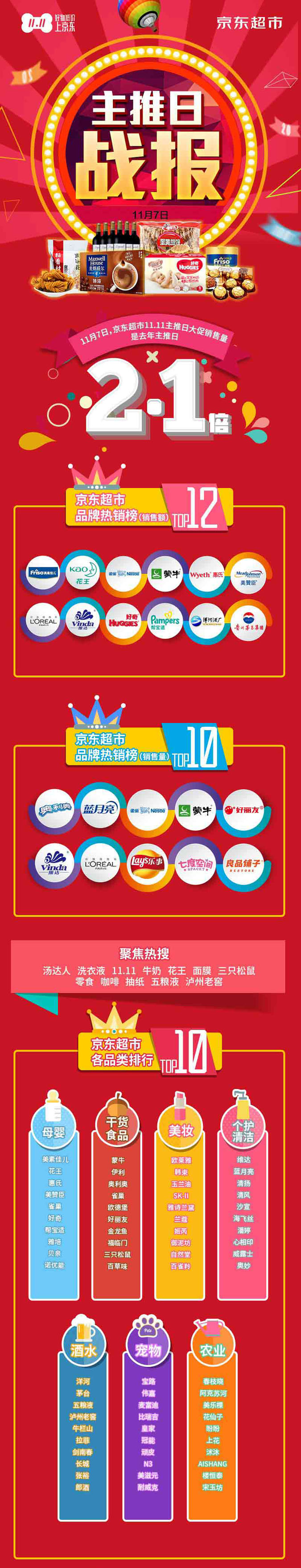 11月7日,京東超市”11.11”大促開啟全品類主推日,母嬰、個護清潔、食品、美妝、酒水等全品類齊”放價”,憑借”好物低價”的實力促銷與品質體驗,引發了全民囤購熱潮。全品類主推日當天,總銷量是去年主推日的2.1倍,移動端占比高達90%,京東超市迎來”11.11”大促期間首個銷售高潮。