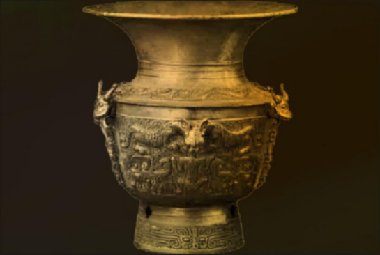 龍虎尊器口侈大,直徑過肩,頸部較高,下部收縮,呈大喇叭狀。肩部微鼓,下折為腹,呈弧形收斂作圜底,圈足,上飾十字鏤空。器肩部飾三條曲身龍紋,圓雕龍首,探出肩外,活靈活現;腹部以云雷紋為地,裝飾三組虎食人紋,寓意詭秘;圈足飾饕餮紋。整器工藝精湛,花紋線條洗練,是商代青銅器中與四羊方尊齊名的珍品。