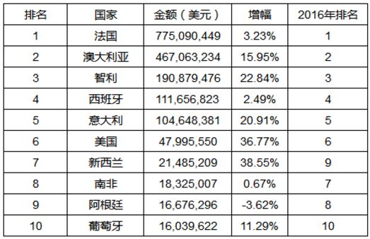 按金額,2017年1-9月瓶裝酒出口至中國的前十位(金額)產酒國分別為: