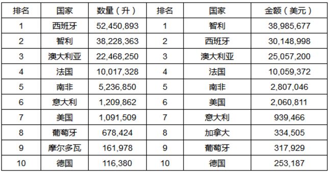 出口散裝葡萄酒至中國的產酒國中,1-9月數量與金額前十位的國家分別為: