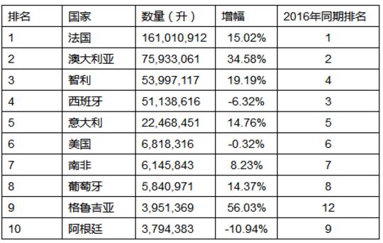 2017年1-9月瓶裝酒出口至中國的前十位(數量)產酒國分別為: