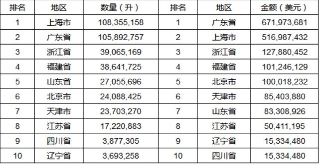 1-9月瓶裝葡萄酒進口量與進口額前十位的省市區分別為: