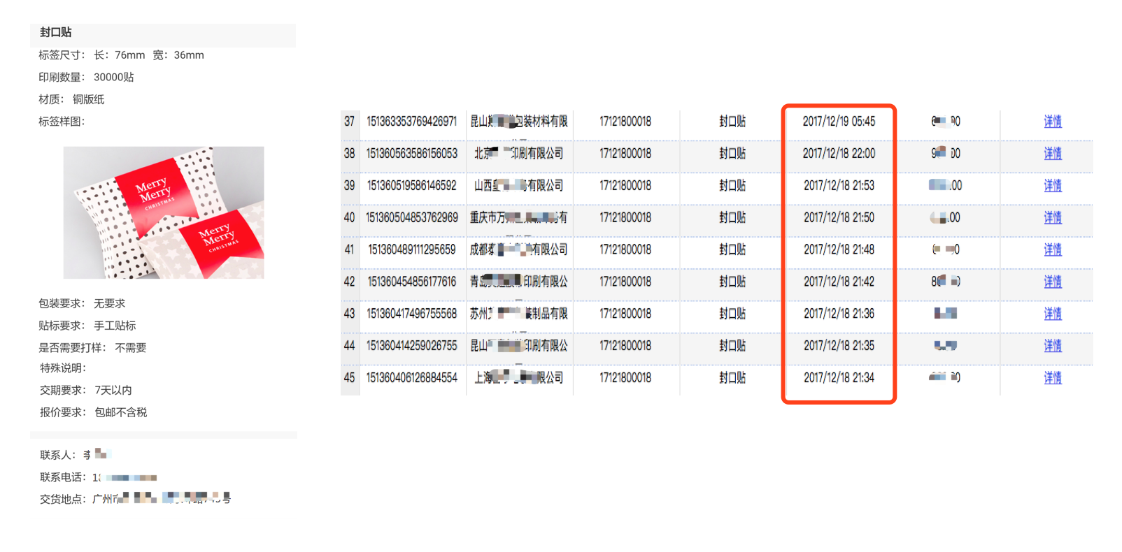 從圖上可以看到,美印團標網的限時競價就像滴滴打車一樣,用戶把需求發往平臺,平臺再把訂單分配派給所有入駐的供應商,然后供應商競爭去接單。所以該限時競價模式也被大家稱為“標簽行業的滴滴打車”。