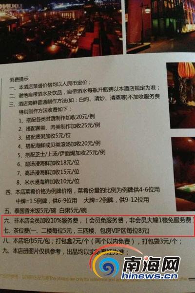 南海網(wǎng)記者還發(fā)現(xiàn),除了對(duì)不同的酒水設(shè)置不同的開(kāi)瓶費(fèi),領(lǐng)市館還設(shè)置了很多其他的強(qiáng)制收費(fèi)項(xiàng)目。包廂設(shè)有最低消費(fèi)限制,非會(huì)員最低消費(fèi)3000元,會(huì)員最低消費(fèi)1800;非會(huì)員加收消費(fèi)總額10%的服務(wù)費(fèi)(會(huì)員不收服務(wù)費(fèi));三、四樓茶位費(fèi)8元/位,一、二樓茶位費(fèi)5元/位。