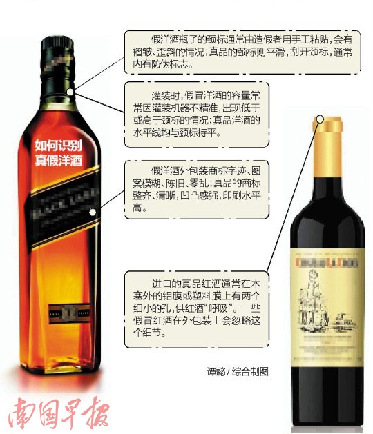在娛樂場所銷售的涉假洋酒則更具隱蔽性。胡先生說,此前曾多次發現,在娛樂場所的超市貨架上,擺放的洋酒是真,但到了包廂里,卻成了“山寨貨”。由于消費者沒有專業知識,而且習慣將洋酒兌上其他飲料,使酒的口感變樣,更加難辨真假。