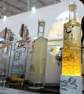 此外,吸引消費者的還有另一款土豪烈酒。一瓶充滿著金箔伏特加在燈光的作用下散發出金黃色光芒,那是相當的“土豪”。據展位負責人介紹,這款伏特加來自澳大利亞的悉尼,金箔不僅對人體沒有任何危害,反而有鎮心,安神,解毒等功效。750毫升的伏特加里的金箔據說折合人民幣近82元錢。這款黃金液伏特加適合與酸橙、蘇打水勾兌可成為黃金雞尾酒。