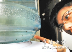 清清牌純凈水里飄滿了黑色的沉淀物 前天,重慶大學B區學生集體出現腹瀉癥狀,疑與飲用今年3月生產的清清牌純凈水有關。昨上午,沙坪壩區衛生、質監、藥監等部門與重慶大學組成聯合調查組展開調查,結果發現清清水廠一個月前就已樓去人空。 兩個學生留院觀察 其他人癥狀