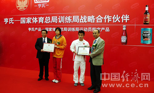 亨氏公司與國家體育總局訓練局建立戰略合作關系 奧運冠軍廖輝、劉子歌為亨氏公司頒發授權證書與牌匾 中國經濟網5月15日訊(記者 何東憲) 國家體育總局訓練局與亨氏(中國)公司今天在京宣布,雙方結為戰略合作關系,亨氏相關系列產品為國家體育總局訓練局運動員指定產品。