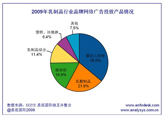 根據易觀國際Enfodesk產業(yè)數(shù)據庫研究顯示,2009年乳制品行業(yè)品牌網絡廣告投放同比上漲42.7%,仍占據食品飲料網絡廣告投放頭把交椅。