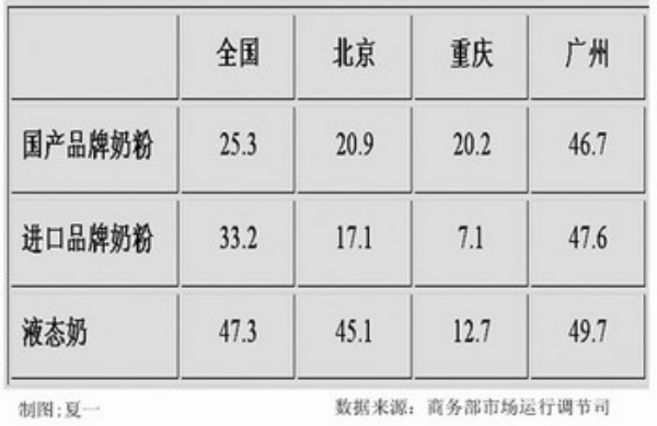 2010年2月份,全國千家重點零售企業液態奶銷量同比增加47.3%,進口品牌奶粉銷量同比增加33.2%,國產奶粉銷量同比增加25.3%。另據對北京市近10家大中超市調研,春節后奶粉銷售量比節前增長近一成,其中,進口奶粉銷售火爆,國產奶粉銷量明顯恢復。據北京的石景山家樂福、北太平莊美廉美、方莊物美等超市反映,3月中旬,惠氏、美贊臣等進口品牌銷售量比年初增長10%—20%,國產伊利、完達山、飛鶴等品牌也增長5%—10%。