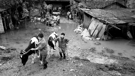 昨日,楊茂才兄弟倆正在轉(zhuǎn)移奶牛見習(xí)記者張永波攝 20日晚,重慶市主城區(qū)降下了今年來最大的一場雨,這場雨