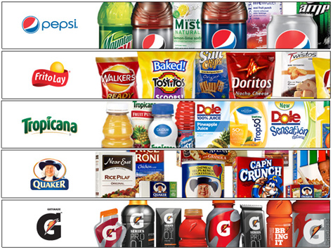 百事是全球最大的飲料和食品公司之一,1965年由百事可樂和食品巨頭菲多利(Frito-Lay)合并,旗下包括百事可樂(Pepsi-Cola)、菲多利 (Frito-lay)、純果樂(Tropicana)、桂格(Quaker)、佳得樂(Gatorade)五大品牌系以及Walkers、Gamesa等區域品牌,產品覆蓋燕麥、稻米、谷類食品以及碳酸和非碳酸飲料。百事擁有22個年銷售額10億美元以上品牌,業務范圍遍布200多個國家,2011年營收665億美元,凈利潤64億美元,員工29.4萬。