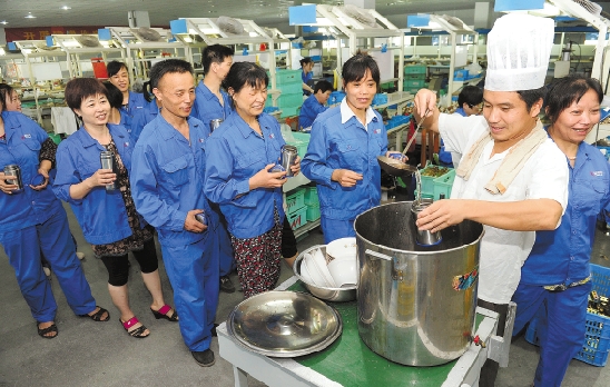7月2日,杭州氣象臺(tái)發(fā)布高溫橙色預(yù)警,杭申集團(tuán)生產(chǎn)車(chē)間里,食堂員工在發(fā)放防暑飲料。(吳元峰 朱林 攝)