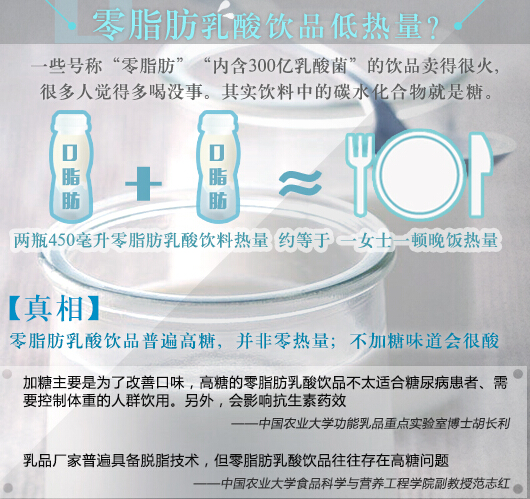 調查發現,一個國內著名品牌零脂肪乳酸飲品的營養成分表中寫著,每100毫升飲料的碳水化合物含量為15.2克。北京大學第三醫院營養生化研究室主任常翠青告訴記者,飲料中的碳水化合物其實就是糖,這樣算來這瓶350毫升的飲料,含糖量高達53.2克。記者計算后得知,喝兩瓶450毫升的零脂肪乳酸飲料,差不多相當于一位女士吃一頓晚飯所攝入的熱量。