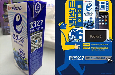 餓了么免費送匯源果汁的定制飲料“e果萃藍莓復合果汁飲料”,在線外賣搭配果汁“e果萃”的銷售模式為餓了么與匯源果汁跨界戰略合作的首次試水。餓了么是中國最大的在線外賣訂餐平臺,截止2014年底,其在線外賣服務已覆蓋全國250多個城市,用戶超過1500萬,日均訂單150萬單。