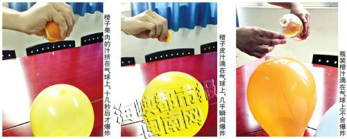 果肉汁:將橙子果肉汁擠出,滴在氣球上,結(jié)果和第一組試驗(yàn)類似,十幾秒后氣球才爆炸。