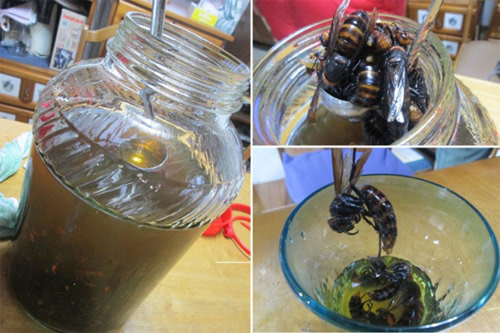 日本大黃蜂是一種毒性極強的蜂類動物,然而,還是有人愿意以身犯險,即使挨上幾蜇也要想方設法捉到它們,為的是釀一種特殊的shouchuu酒(類似于伏加特)。這種看著就沒有食欲的發酵黃蜂shouchuu酒呈現出一種爛泥巴的顏色,而且聞起來有點像腐尸散發的氣味。