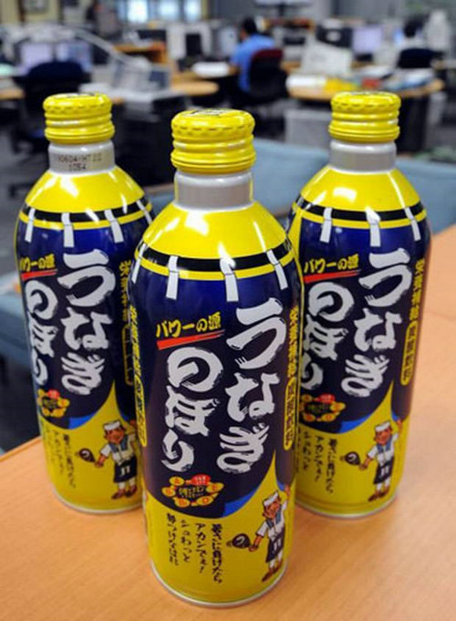 在日本,人們想提神時會喝鰻魚湯、鰻魚酒,或者鰻魚功能飲料。這種黃色的“鰻魚浪涌”飲料中含有鰻魚頭骨部位的提取物,喝起來“魚味”十足。