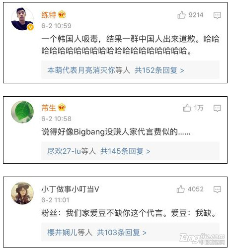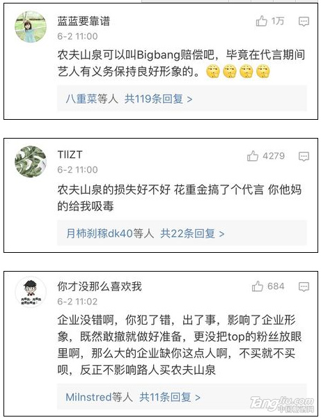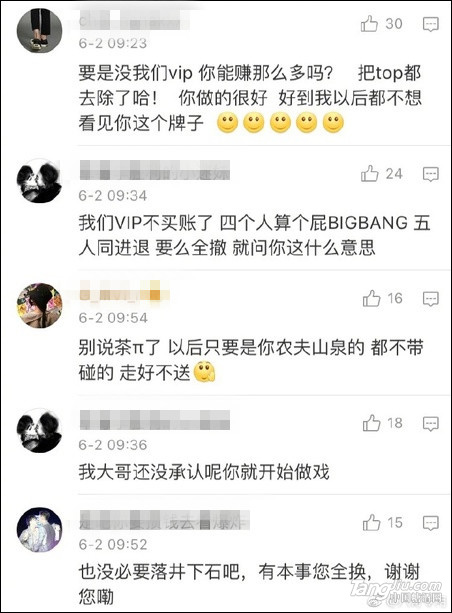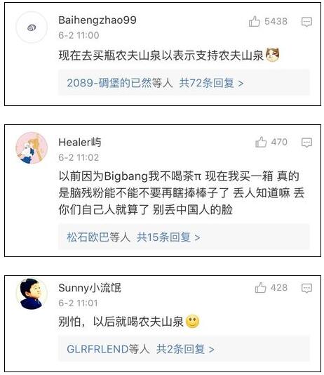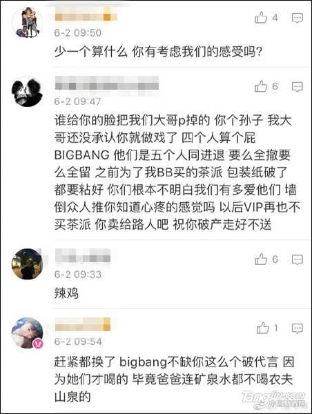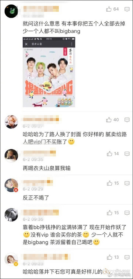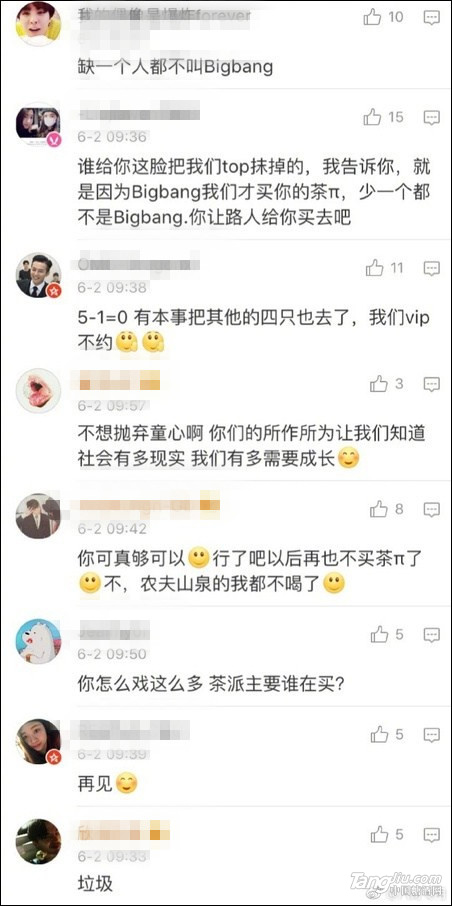 然而,6月2日,微博網友@八哥專用 曝出,由于在廣告圖中撤下了TOP,農夫山泉茶π官微6月1日的微博遭到了部分Bigbang極端粉絲的圍攻。
