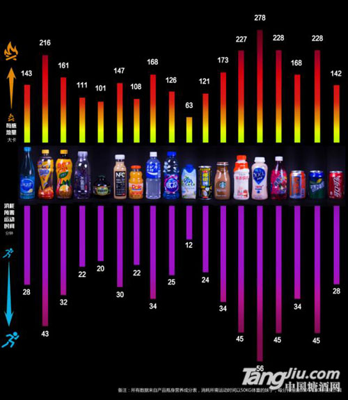 下圖很直觀明了地展現(xiàn)了,喝完每一款飲料之后所付出的代價(jià):即喝完這款飲料你需要在跑步運(yùn)動(dòng)多久才能抵消所攝入的熱量。