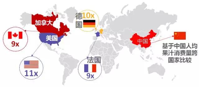 目前果汁在中國的人均消費量相對來說比較低,一些發達國家的消費量大約是中國的10倍左右。