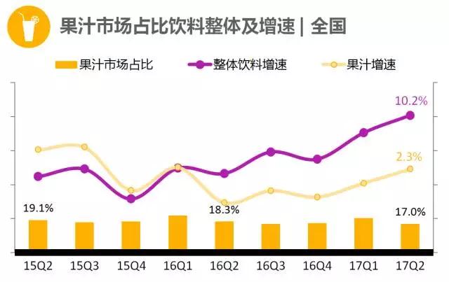 果汁在整個中國飲料行業里只占到了兩成的比重,相比整體飲料行業的增幅,果汁呈低增長態勢,因此果汁在市場增長表現良好的情況下,整體比重還在逐年下降。