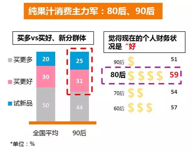 當我們問消費者,如果你有一筆固定的錢,你愿意去買更多,還是愿意買更好,還是買更新?發現90后愿意買更好的東西,或者買更新的東西,這部分跟純果汁的定位是很契合的。