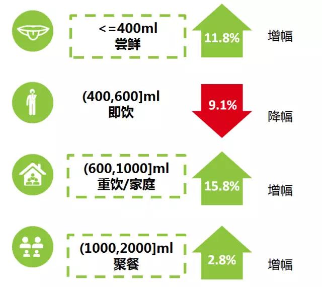 對純果汁來說,規格包裝(400-600毫升)并不是最重要的,最重要的是小包裝(400毫升以下)。在消費者還沒有購買過這一產品前,大多只愿意買一個小一點進行嘗試,做小包裝能夠吸引到一些新的消費者。