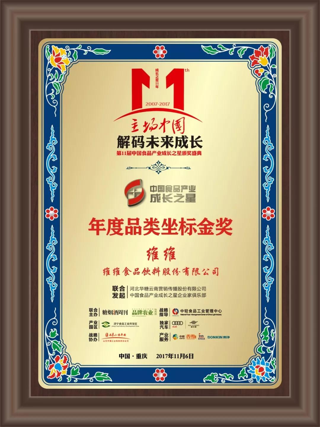此外,在有著食品界奧斯卡之稱的第十一屆中國食品產業成長之星評選活動中,維維液態豆奶系列更是摘得年度品類坐標唯一金獎,彰顯了維維豆奶強大的品牌力與影響力。