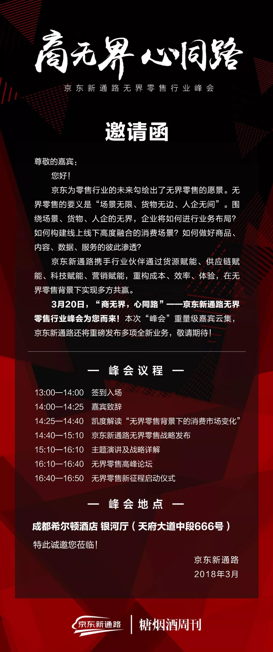 3月20日,京東新通路將攜手《糖煙酒周刊》,在成都希爾頓酒店銀河廳共同舉辦“商無(wú)界,心同路”——京東新通路無(wú)界零售行業(yè)峰會(huì),同時(shí)廣邀食品、酒水、飲料等行業(yè)廠商、經(jīng)銷商、批發(fā)商到場(chǎng)參會(huì)。