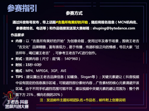 以下是“王老吉·抖音豎屏共創大賽”的參賽方式、評審標準以及獎項設置。誠摯邀請感興趣的創作者積極參與。