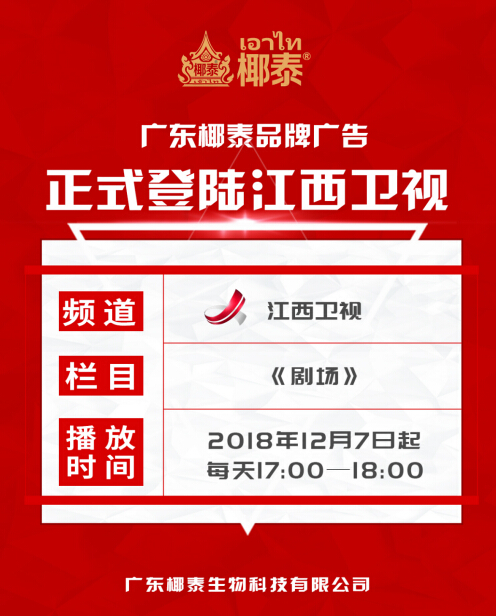 品牌實力獲認可,椰泰椰子品牌廣告登陸江西衛視!