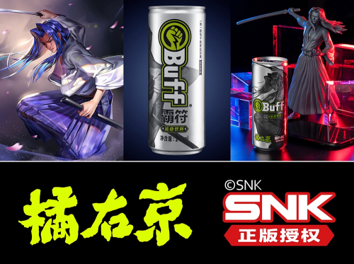 此外,IP是最近幾年消費市場上的制勝武器,90后消費者對IP尤為買單。故宮文創崛起、大白兔和熊本熊的風靡,說明IP給產品帶來的人氣非??捎^。而IP恰恰是Buff的又一殺手锏,Buff能量飲料罐身使用的橘右京由SNK正版授權,和國民手游《王者榮耀》里的橘右京是同款,這也給Buff能量飲料加分不少。