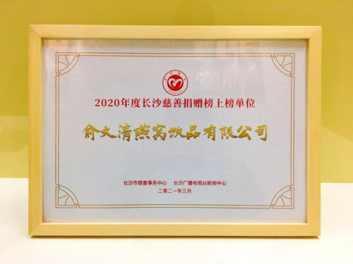 3 月 31 日,由市民政局、市文明辦、團市委、市婦聯指導,市慈善事務中心、長沙市電視臺新聞中心主辦,市慈善總會、市青少年發展基金會、市學雷鋒志愿服務基金會、市婦女兒童發展基金會、長沙廣電《公益長沙》欄目承辦的 2020 年度“長沙慈善榜”發布典禮在長沙舉行,典禮上公布了“2020年度長沙慈善捐贈榜”及“2020 年度長沙慈善影響力榜”,俞文清燕窩水因在疫情期間積極履行企業責任,通過愛心捐贈為抗疫貢獻力量,獲表彰為慈善捐贈榜上榜單位。這份表彰,是對俞文清燕窩水勇擔責任積極貢獻的肯定。