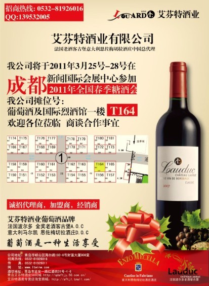 艾芬特酒業(yè)于2011年3月25日至3月28日參加成都2011全國(guó)春季糖酒會(huì), 歡迎各位蒞臨參觀,洽談合作事宜。 我