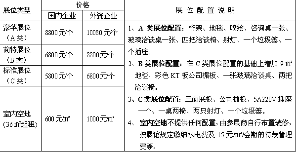 1、展位費(fèi)用:(2011年9月10日前報(bào)名參展并交清參展費(fèi)用的,送三星級酒店標(biāo)間1間3天住宿,參展面積在36㎡以上的特裝企業(yè),加送會刊彩頁1版和彩拱門1個,逾期不再享受此優(yōu)惠活動)。