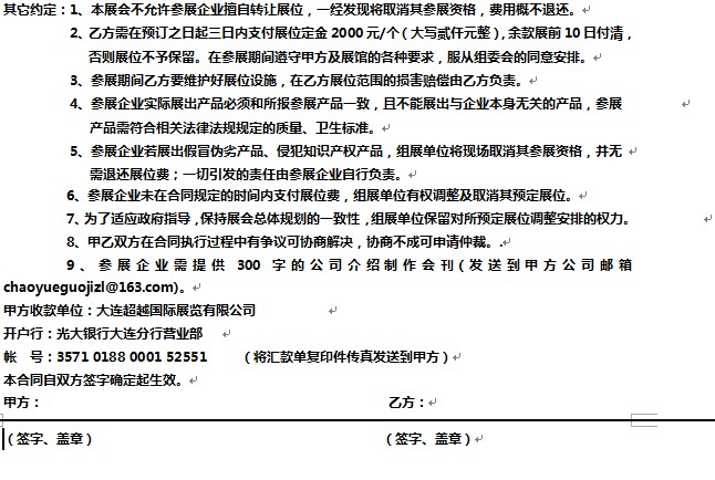 (二)參展費用一次性交齊,確認展位,否則不予保留。展費匯出后將銀行底單傳真至組委會;
