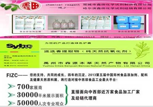 中西部最大食品添加劑配料展--2013第五屆中國鄭州食品添加劑、配料及健康天然原料展覽會(以下簡稱FIZC)將于5月29日在鄭州國際會展中心開幕, 力邀700展商,50000觀眾參加,規模再次升級,更多企業匯聚中西部市場,2013FIZC將著力鑄造中西部食品配套產業專業盛會!